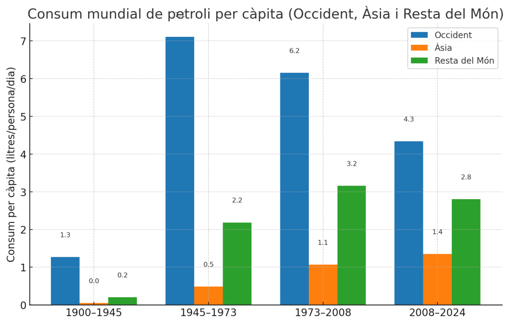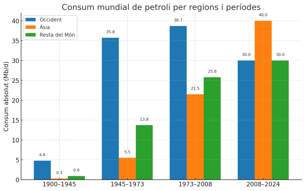 – Finalment l’últim període, des de la crisi del 2008 fins a l’actualitat, mostra el capgirament del poder econòmic al món. Occident consumeix menys petroli tant en brut com en proporció, el 40%, però probablement molt més del que es mereix pel seu pes real en l’economia mundial, i Àsia es dispara com és lògic que ho faci la indústria del món.